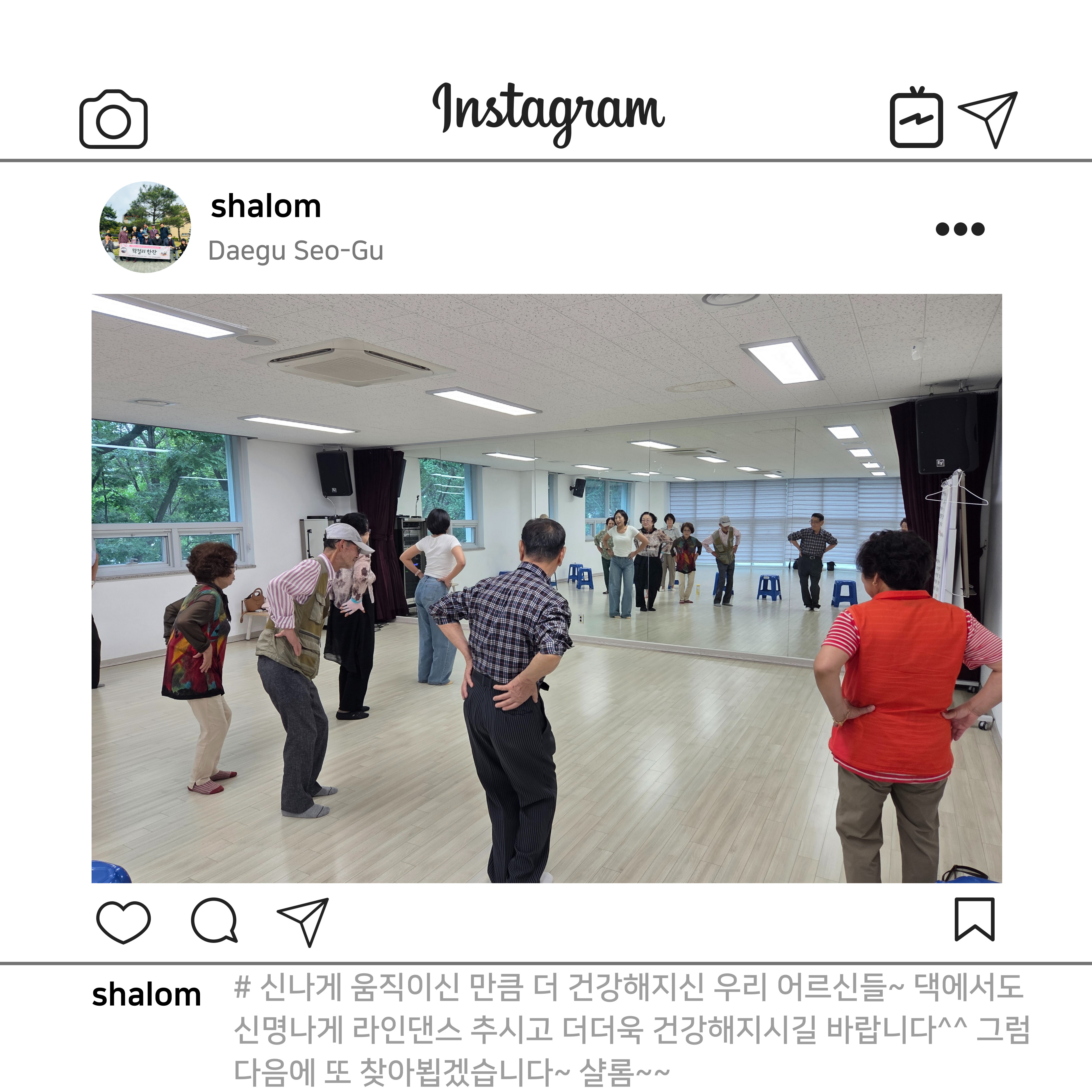 #샬롬재가노인돌봄센터 #재가노인지원사업 #어르신과함께 #대구광역시행복진흥사회서비스원 #강사파견지원사업 #샬롬문화센터 #신체활동 #라인댄스 #스트레스해소 #댄스가건강 #어르신 #항상 #건강하세요 #상중이동 #평리5동 #평리6동 #내당1동 #내당4동