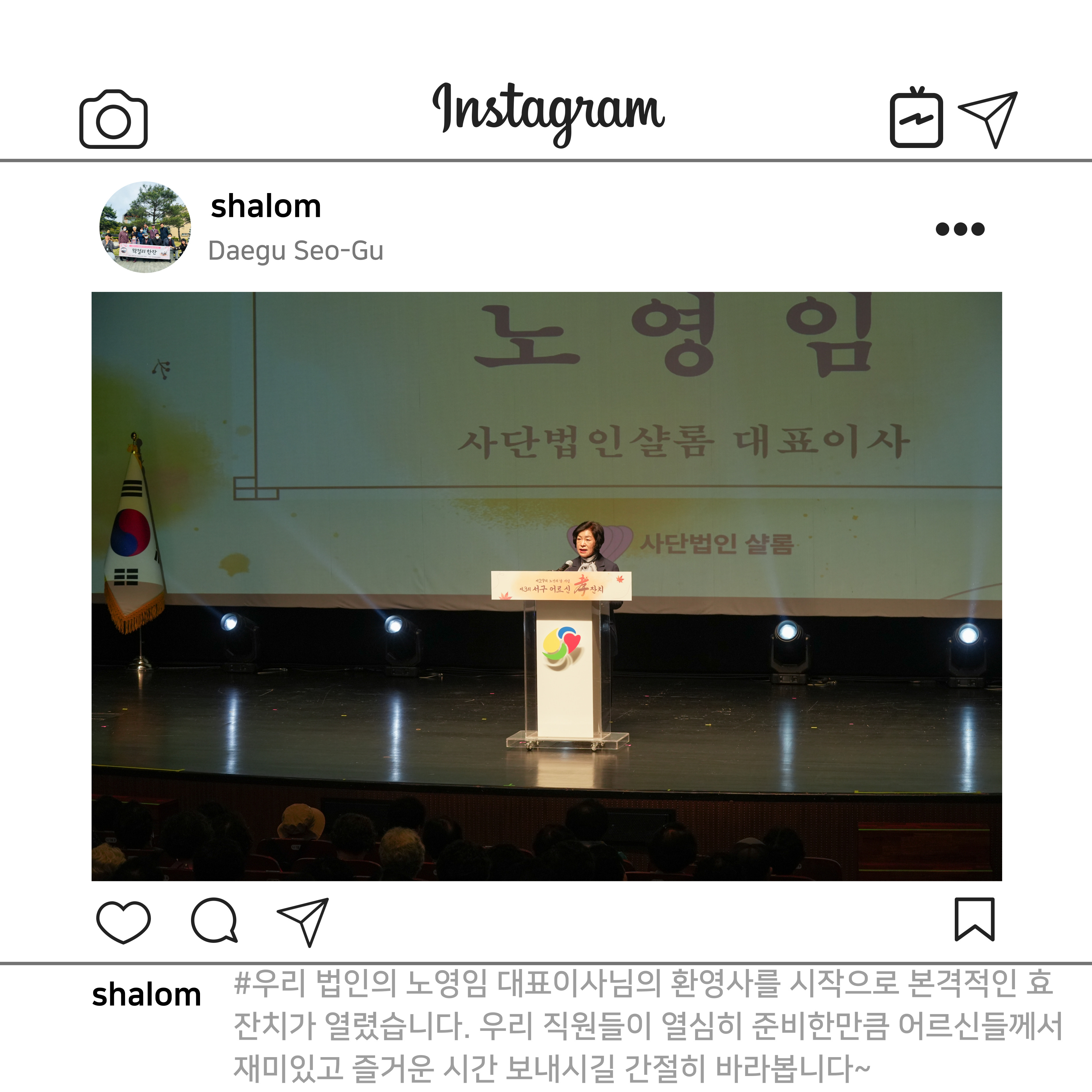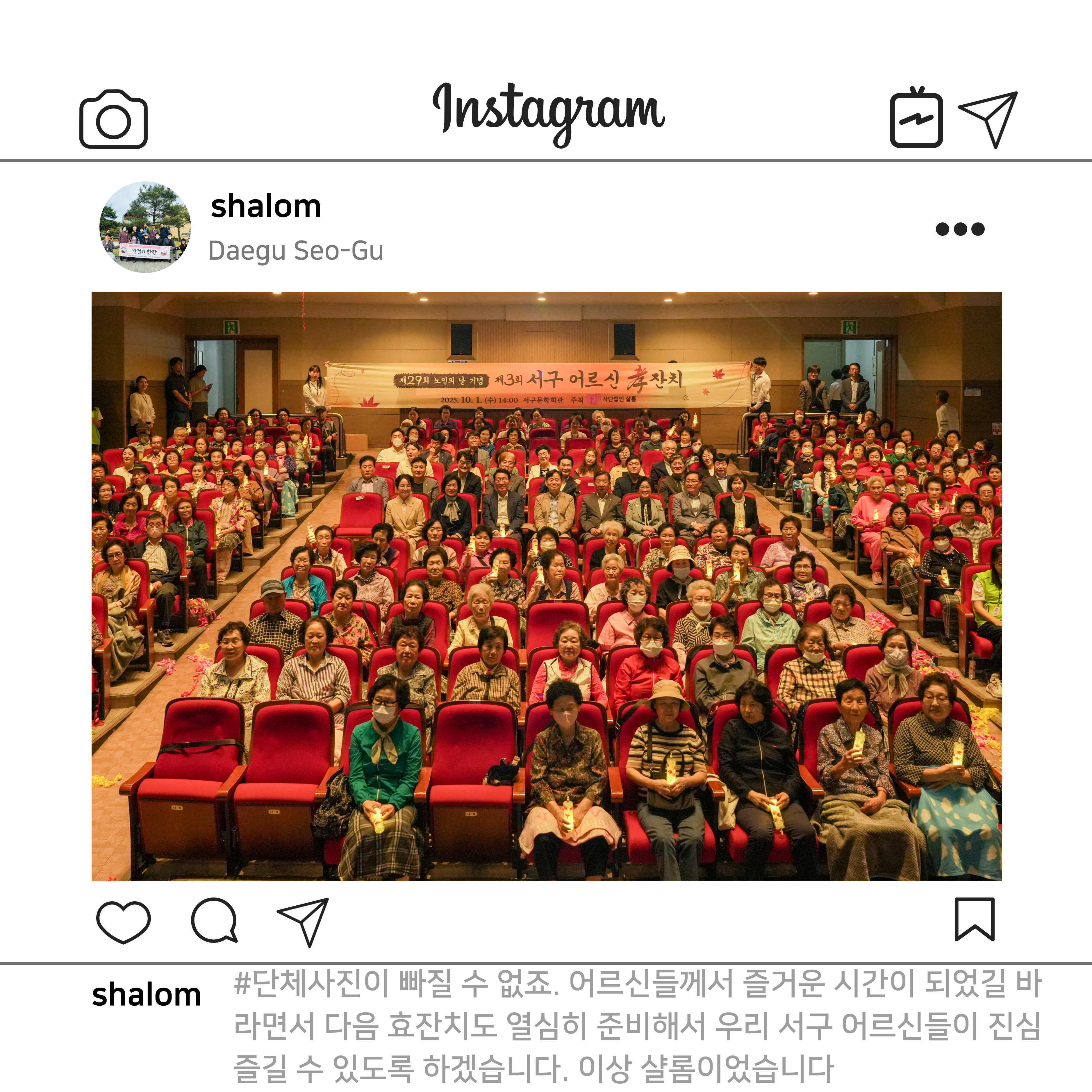 #샬롬재가노인돌봄센터 #재가노인지원사업 #어르신과함께 #사단법인샬롬 #제29회노인의날 #제3회서구어르신효잔치 #서구문화회관 #소망맘앤댄스 #sj섹소폰 #황태자 #멋진공연 #어르신께감사 #효로하나되는우리 #상중이동 #평리5동 #평리6동 #내당1동 #내당4동